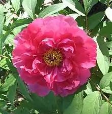 Paeonia × suffruticosa is a name used for a group of cultivars of tree peonies that are the result of hybridisation with species exclusively belonging to the subsection Vaginatae. The common name used in China is mǔdān (Chinese: 牡丹). Plants belonging to this group have been cultivated for millennia in China, initially only as a source of traditional Chinese medicine particularly the skin of its roots (牡丹皮; mǔdān pí). Already early on the plant was also cultivated for its ornamental value, and it is highly revered in Chinese culture.