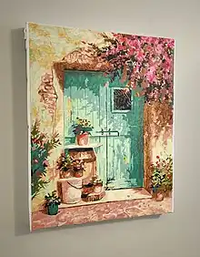 Paint by number or painting by numbers kits are self-contained painting sets, designed to facilitate painting a pre-designed image. They generally include brushes, tubs of paint with numbered labels, and a canvas printed with borders and numbers. The user selects the color corresponding to one of the numbers then uses it to fill in a delineated section of the canvas, in a manner similar to a coloring book.