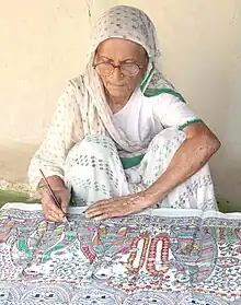 One is Mithila painting, a style of Indian painting used in the Mithila region of Bihar. Traditionally, painting was one of the skills that was passed down from generation to generation in the families of the Mithila region, mainly by women. Painting was usually done on walls during festivals, religious events, and other milestones of the life cycle, like birth, Upanayanam (the sacred thread ceremony), and marriage.[9] Mithila painting was traditionally done on huts' freshly plastered mud walls, but today it is also done on cloth, handmade paper, and canvas. Famous Mithila painters have included Smt Bharti Dayal, Mahasundari Devi, the late Ganga Devi, and Sita Devi. Mithila painting is also called Madhubani art. It mostly depicts human beings and their association with nature. Common scenes illustrate deities like Krishna, Ram, Shiva, Durga, Lakshmi, and Saraswati from ancient epics. Natural objects like the sun, moon, and religious plants like tulsi are also widely painted, along with scenes from the royal court and social events like weddings. Generally no space is left empty.[9]