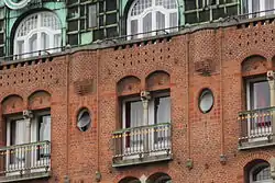 The Palace Hotel building is considered one of Rosen's most important works and shows clear evidence of his appreciation of Jugendstil.[6] He received the commission shortly after completing the Løvenborg building on nearby Vesterbrogade, the first example of the style in Denmark.[7] The building is constructed in red brick and stands on a sandstone plinth. The portal and other details on the facade are also in sandstone. The copper canopy above the main entrance is a later addition.