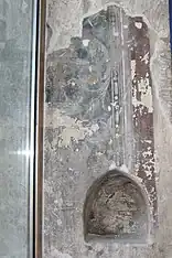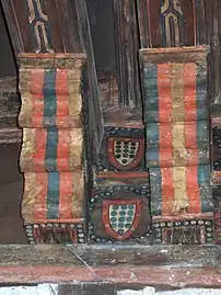 In the main hall on the second floor, small polychromes are preserved in the wooden coffered ceiling, while in the main hall, on the second floor, the remains of a splendid polychrome and carved coffered ceiling are preserved, which was restored in 2006 through an agreement between the Junta of Castile and León and the City Council of Cuéllar, with a budget of 81,996 euros at 50% each.[8]