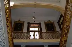 The interior is marked by an ample atrium, with stone floors, azulejo tile, stucco and white-painted walls, divided by pilasters.[1] From this atrium is a staircase that extends to the second floors, with an intermediary landing that divides into two flights of parallel staircases with worked iron guardrails and eight-sided lantern.[1] All the halls has stucco ceilings and walls with painted white.[1] The dance hall has a vaulted ceiling with musical decorations and a small varanda.[1]
