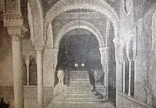 The Plaza del Duque de la Victoria, houses of the Marqués de Palomares, Sánchez Dalp and de la Familia Cavaleri including the Hotel Venice and the school Colegio Alfonso X el Sabio, formed an Eclectic, Sevillan Regionalist, true architectural style of the 16th century.[3] One of the most spectacular elements of the palace structure were the stairs to the top floor, plasterwork of both windows, arches, and walls, as well as two lions flanking the stairs.[4]