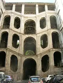 The Palace was erected during 1724 to 1726 by the architect Ferdinando Sanfelice. The entrance portal has two stucco sirens of the Sanfelice family. Through an indistinct façade one enters to an interior octagonal courtyard leads to a double ramp stairwell. The interior frescoes originally by Francesco Solimena are now lost. The staircases with arches in shifting planes still grants an aura of complex scenography, despite its present cramped and dilapidated state: a grandiose entrance leading only to a decrepit palace.[1] The nearby Palazzo dello Spagnolo is attributed to the same architect and has similar staircases. 40°51′27″N 14°15′05″E / 40.857580°N 14.251400°E