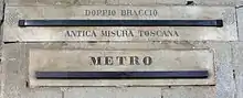 On a wall of the palace is a display of the length of a Florentine "Braccio", the particular measure used in Tuscany, prior to the Napoleonic conquest, which ushered in the metric measurement (also featured). The Palazzo was the home to the meetings of the Pistoian Academy of Sciences, Letters and Arts from its foundation in 1803 until 1811, when the Napoleonic authorities granted them the suppressed convent of Santa Maria del Carmine of Pistoia.[6]