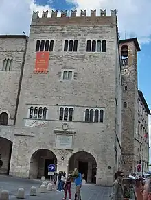 The palace was erected in 1213-1228, thus decades before the adjacent Palazzo del Capitano. The wide staircase that serves as a bridge into the main council room was added in 1267 by the Podestà Pandolfo Savelli. The orientation of the main facade was established in the 16th century. The palazzo was extensively refurbished in the 19th-century, which added the merlons to the rooflines of two buildings in this piazza.[1][2]