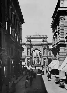 The large building, erected to a design by architect Vincenzo Micheli (1895), defines itself as a scenographic backdrop to the square, laid out from 1883 with the destruction of the Mercato Vecchio and the Jewish pond. Beyond its being a palace, the architecture transcends the need to offer a civil dwelling building in the bourgeois sense, to become a monumental urban sign, and impose itself through the great archway leading onto Via Strozzi, developed to include the two orders of the façades of the lateral buildings, each of which is developed for a further six axes, the last of which is overhanging. Each of these lateral bodies then develops deeply into the respective blocks, two internal courtyards towards via Brunelleschi, and an elongated one towards via Pellicceria. The wide and high archway with the large central body, adorned with statues and crowned by the plastic group of the Italy enthroned accompanied by the figures of Art and Science (removed in 1904), framed the equestrian statue of the king Victor Emmanuel II of Savoy, placed in the centre of the square and later moved to the Piazzale delle Cascine.[4] The three statues were mockingly renamed by the Florentines with the names of three prostitutes of the period, as can be found in some satirical sonnets of the time by Vamba and others: the Starnotti or Schiccherona, a tenant of Russian origin whose surname was Starnowka; then the Cambarbini and the Trattienghi.[5]