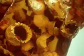 Burmese amber is fossil resin dating to the early Late Cretaceous Cenomanian age recovered from deposits in the Hukawng Valley of northern Myanmar. It is known for being one of the most diverse Cretaceous age amber paleobiotas, containing rich arthropod fossils, along with uncommon vertebrate fossils and even rare marine inclusions. A mostly complete list of all taxa described up until 2018 can be found in Ross 2018;[1] its supplement Ross 2019b covers most of 2019.[2]
