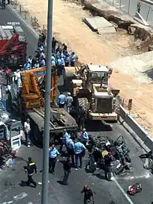 There were two attacks that represented new developments in terms of political violence inside Israel in this period. The first Palestinian suicide attack took place on July 6, 1989, when a member of the Palestinian Islamic Jihad boarded the Tel Aviv Jerusalem bus 405. He walked up to the driver and pulled the wheel to the right, driving the vehicle into a ravine, killing 16 people.[55] The end of the intifada also saw the first use of suicide bombing as a tactic by Palestinian militants. On April 16, 1993, Hamas carried out the Mehola Junction bombing, in which operative Saher Tamam al-Nabulsi detonated his explosives-laden car between two buses. One person, a Palestinian, other than the attacker was killed, and 21 were wounded.[56]