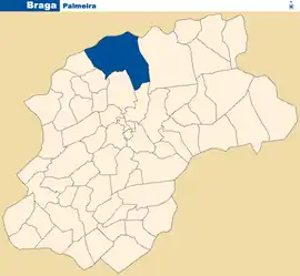 Palmeira is a Portuguese parish, located in the municipality of Braga. The population in 2011 was 5,468,[1] in an area of 8.88 km².[2] It is located near the Cávado river, on the south bank, about 5 mi (8.0 km) north from the historic center of the city of Braga.