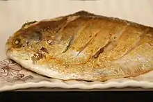 Pomfret is especially popular in Kuwait, and it is one of the most expensive types of fish in the market,[5][6] with the Kuwaiti Pomfret (Gulf Arabic: زبيدي كويتي, romanized: zbēdi kwēti), caught in the waters of Kuwait, being the most sought-after followed by the Iranian Pomfret (Gulf Arabic: زبيدي ايراني, romanized: zbēdi īrāni). The Kuwaiti government regularly bans the fishing of the Kuwaiti type to allow the fish to reproduce.[5] Mtabbag Zbedi (Gulf Arabic: مطبق زبيدي, romanized: mṭabbag zbēdi) is a popular Kuwaiti dish made with fried Pomfret, spices, and rice, with daqqūs, Kuwaiti home-made hot sauce, usually added.
