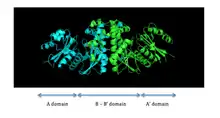 PanK-II contains two protein domains, as illustrated in Figure 1. The A domain and A' domain each has a glycine-rich loop (sequence GXXXXGKS; P loop) that is characteristic of nucleotide-binding sites; this is where ATP is assumed to bind.[7] located between residues 95 and 102 on the A domain