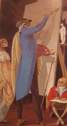 One of his most noted works was scenes of the cycle of living skeletons that were commissioned by the Parish of Santa Grata Inter Vites Borgo Canale to remember the celebration of the Triduum of the dead. These paintings, after being exposed annually during the Triduum of the Dead in the parish of Borgo Canale, were exhibited at the Palazzo Pitti in Florence in 1922, with great success. Noteworthy are also some decorations of public and private buildings in the Bergamo area, as well as the collection of his drawings kept at the Civic Art Collections of the Sforza Castle in Milan.