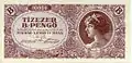 | 5 pengő | 121 × 59 mm | Mrs. Ferenc Bugárdi (Ms. Julianna Csonka) Female model from Bény | Statue of Sebestyén Tinódi Lantos by Gyula Bezerédi | 25 October 1939 | 18 March 1940 | 5 August 1942 | ||