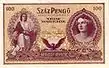 The first denomination of the second series of pengő banknotes was the 1000 pengő note, designed by Zoltán Egri.[1] In contrast to the 1926 series, this banknote (as well as the other notes of this series) was printed using intaglio printing. The next banknote of the series was the 5 pengő note (dated 1928), then the 10 pengő (1929), 20 and 100 pengő (1930), and the 50 pengő notes (1932). These banknotes were designed by Álmos Jaschik.[2]