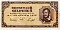 1,000,000 pengő | 167 × 84 mm | Lajos Kossuth | Géza Mészöly's painting: "Balaton scene" | 16 November 1945 | 28 February 1946 | 24 June 1946 |