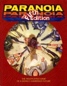 Paranoia is a dystopian science-fiction tabletop role-playing game originally designed and written by Greg Costikyan, Dan Gelber, and Eric Goldberg, and first published in 1984 by West End Games. Since 2004 the game has been published under license by Mongoose Publishing. The game won the Origins Award for Best Roleplaying Rules of 1984[1] and was inducted into the Origins Awards Hall of Fame in 2007.[2] Paranoia is notable among tabletop games for being more competitive than co-operative, with players encouraged to betray one another for their own interests, as well as for keeping a light-hearted, tongue in cheek tone despite its dystopian setting.