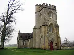 The Church of England parish church of Saint Peter has a blocked two-bay arcade in the north wall of the nave that shows there used to be a north aisle.[3] The lower part of the bell-tower is Perpendicular Gothic and the south chapel remains as it was built in 1545, but the remainder of the building was remodelled in the Georgian Gothick fashion in about 1820.[3] The font is a rare lead one from the middle of the 14th century, repeatedly inscribed with the legend IHS Nazar and the arms of Sir Andrew Peverel (d. 1376),[4] who was a Knight of the Shire in 1351.[3]