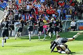 Noilhan had left the club shortly before the final, leaving Vaz as the sole coach.[8][9] This, however, did not stop PSG from crushing defending champions Montpellier at the Stade Robert Bobin to claim their first major title as well as their second trophy ever and their first since 2001.[2] Emblematic club striker Ingrid Boyeldieu, who would retire at the end of the season, opened the scoring in the first half. After the break, PSG added four more goals for a brutal 5–0 scoreline, the largest victory in the history of cup finals.[1][3]