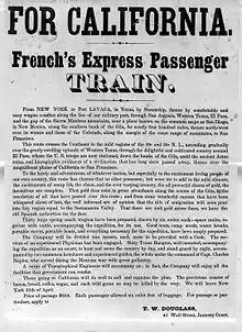 French and his wife arrived in New York City about the beginning of 1850. Daughter Matilda Strong French was born there in February.[14][15] Before long, French – having granted himself the rank of "Captain" – had taken an office in the Tammany Building,[16] had placed ads in the newspapers, and had flyers printed describing his plan to lead an expedition to the gold fields of California for a fee of $250.[17] One flyer began,