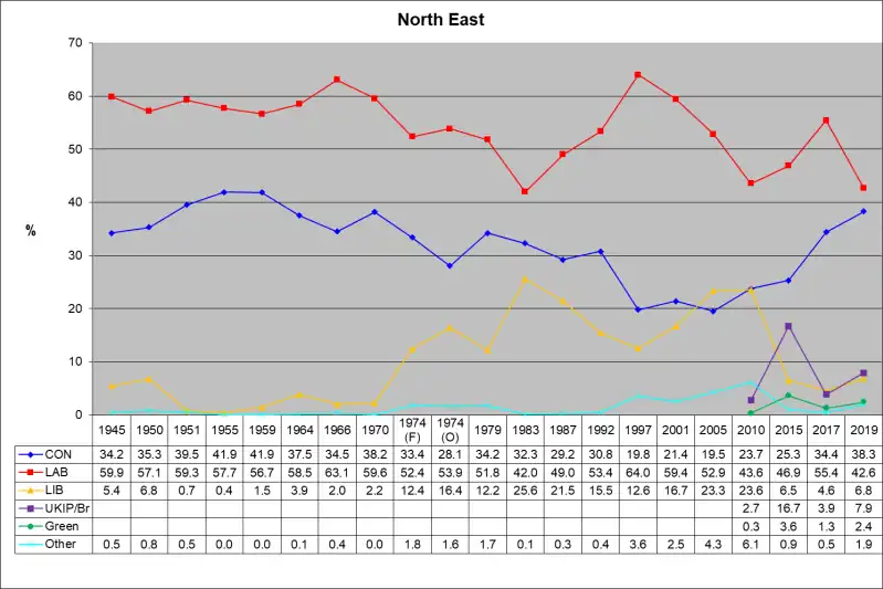 The region[1] of North East England is divided into 29 parliamentary constituencies which is made up of 19 borough constituencies and 10 county constituencies. Since the 2019 general election,[2] 17 are represented by Labour MPs and 11 by Conservative MPs. One is an independent.