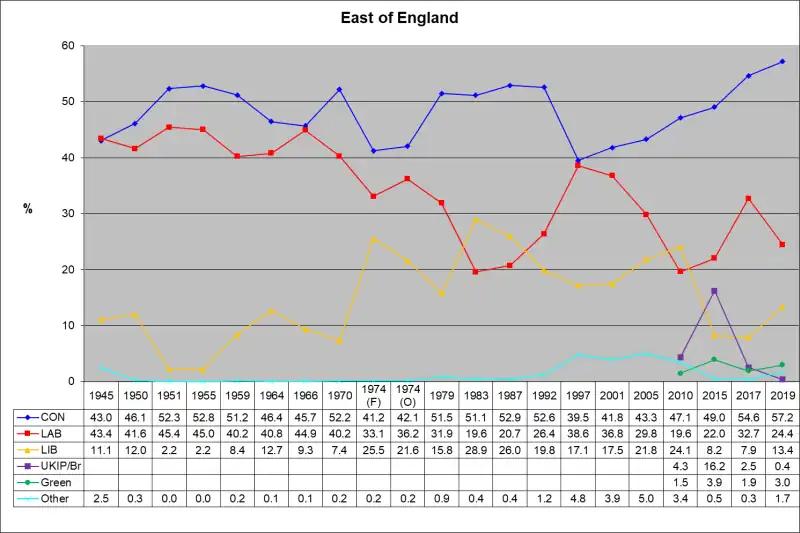 The region[1] of the East of England is divided into 58 parliamentary constituencies which is made up of 16 borough constituencies and 42 county constituencies. Since the general election of December 2019,[2] 51 are represented by Conservative MPs, six by Labour MPs, and one by a Liberal Democrat MP.