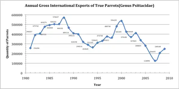 The chart below graphs the gross exports of true parrots, members of the family Psittacidae, a subtaxon of the order Psittaciformes.