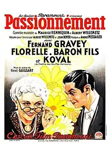 Passionately (French: Passionnément) is a 1932 French musical comedy film directed by René Guissart and Louis Mercanton and starring Florelle, Fernand Gravey and René Koval.[1][2] It was produced by the French subsidiary of Paramount Pictures and shot at the Joinville Studios in Paris. It is an operetta film, based on the 1926 stage work of the same title composed by André Messager.