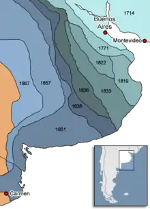 The publication of Thomas Falkner's book A Description of Patagonia and the Adjacent Parts of South America in England fuelled speculations in Spain about renewed British interest in Patagonia. In response an order from the King of Spain was issued to settle the eastern coast of Patagonia.[58] This led to the brief existence of colonies at the Gulf of San Jorge (1778–1779) and San Julián (1780–1783) and the more longlasting colony of Carmen de Patagones.[58]