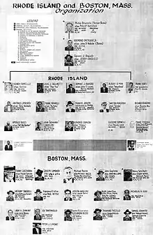During the early 1910s, Gaspare DiCola became the most powerful Mafia boss in Boston until he was murdered on September 21, 1916.[2] This allowed Gaspare Messina, a Sicilian mobster who had close ties to Bonanno crime family in New York City, to become the new boss of the Boston Mafia group.[3][4] The Providence Mafia group formed sometime in 1917, under Frank Morelli,[5] who went on to control bootlegging and illegal gambling operations in Providence and Connecticut.[6]