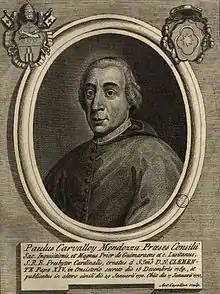 Paulo António de Carvalho e Mendonça (1702–1770)[1] was a Portuguese priest and a cardinal, a court official who served as supervisor of the house and properties of Queen Mariana Vítoria, President of the Senate of Lisbon,[2] a Canon of Lisbon Cathedral, Grand Prior of the College of Guimarães[3] and Inquisitor-General of the Holy Inquisition.