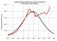 In 1971, Hubbert revised his peak gas estimate based on updated reserve information. He revised his estimated ultimate recovery upward to 1,075 trillion cubic feet (30,400 km3) for the lower 48 states only, and predicted: "For natural gas, the peak of production will probably be reached between 1975 and 1980."[30] Gas production for the lower 48 states did peak in 1979, and declined for several years, but rose again, and once more Hubbert's assumed EUR of 1,075×10^12 cu ft (30,400 km3) proved to be too low, as actual lower 48 state production from 1936 through 2012 has already exceeded 1,265×10^12 cu ft (35,800 km3), 18% higher than the estimated EUR of 1,075.[31]