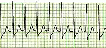- ventricular tachycardia (VT): fast rate, originates in the ventricles, wide QRS (> 0.09 seconds)[4]