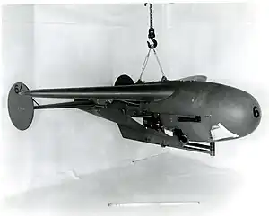 The project that led to the development of Pelican was initiated by the National Defense Research Committee in 1942. Two main guided-bomb programs were established for use by the U.S. Navy's Bureau of Ordnance; one led to the active radar-guided Bat, which saw operational service near the end of the war, while the other was for a bomb controlled by a semi-active radar seeker,[1] which was designated Bomb Mark 55 and named Pelican.[2]