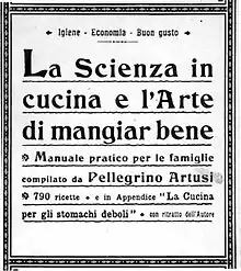 His manual, however, entitled La scienza in cucina e l'arte di mangiar bene, was much more successful. In 1891, at age 71, he completed his cookbook, but could not find a publisher. So he used his own money to self-publish, selling a thousand copies of the first edition in four years.[4] Soon, however, the cookbook caught on, and before Artusi died, more than 200,000 copies had been sold. Filled with amusing anecdotes as well as recipes, the book is a perennial best seller in Italy, and has been translated into Spanish, French, Dutch, German, English and, most recently, Portuguese and Polish.