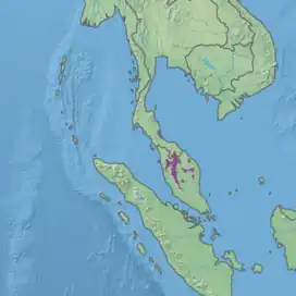 The ecoregion occupies elevations above 1000 meters in the Titiwangsa Mountains, which form the mountainous backbone of the Malay Peninsula. It also includes ranges to the east in Kelantan, Terengganu, and Pahang states. The highest peak in the Titiwangsa Mountains is Mount Korbu at 2,183 meters elevation. Other peaks include Mount Tahan (2,188 m), the highest peak in peninsular Malaysia, and Mount Benum (2,130 m). The ecoregion is surrounded at lower elevations by the ecologically-distinct Peninsular Malaysian rain forests.[2][3]