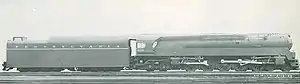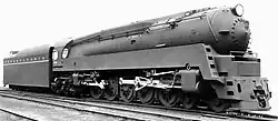 PRR's Board approved $595,000 for the construction of this experimental Class dual service locomotive on Oct. 9, 1940. it was built in March 1942. Its streamlined shrouding, according to an interview of John W. Epstein, Special Projects Manager and vice president, Raymond Loewy & Assoc.,[2] was designed by Raymond Loewy, but,due to WWII, there was no publicity about it. The Q1 was a duplex locomotive; it had a wheel arrangement of 4-6-4-4, consisting of a four-wheel leading truck, two sets of driving wheels (six followed by four) in a rigid locomotive frame and a four-wheel trailing truck. The first group of six driving wheels was driven by a pair of cylinders mounted conventionally in front of them, while the rear four driving wheels were driven by cylinders mounted behind them on either side of the firebox.[3] As a locomotive designed for dual service like PRR M1s,[4] it was given larger-sized driving wheels at 77 in (1.956 m), which was as large as the Grand Trunk Western class U-4-b 4-8-4 "Northern" type.