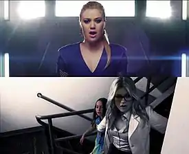 The accompanying music video for "People Like Us" was directed by Chris Marrs Piliero.[21] Filmed on April 9, 2013 at Mission Street Laboratories in South Pasadena, California, it utilizes a 2.39:1 anamorphic format (similar to "Catch My Breath").[22] A twenty-second preview of the video was broadcast on E! News on May 24, 2013, with the full video premiering on VEVO on May 28, 2013.[21][23] The video utilizes several special effects shots, including the use of chroma key compositing and computer-generated imagery. In the video, Clarkson portrays a scientist breaking away from a monochromatic atmosphere and into a colorful one, accompanied with a young girl in full color.