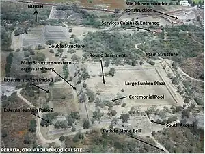 The monumental Peralta architecture is an indication of the highly specialized architects and crafts of its times, it is indeed an impressive architectural expression of the Bajio Tradition. As opposed to the typical mesoamerican open patios or squares, Peralta is distinguished by sunken patios surrounded by rooms and bordered by one or more temples, aligned with equinoxes. Another Peralta characteristic is the presence of circular structures, typically used for ceremonial rituals, probably dedicated to wind, rain and fertility deities. It is believed that Peralta had socio-cultural relations with other regions, such as Guachimontones (Teuchitlán, Jalisco) and Chalchihuites, Zacatecas.[4]