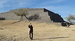 It is a stepped rectangular structure oriented east–west with external side walls built at an approximate 45 deg., angle, built from stone and earth, stucco and finishings of clay mixed with vegetal fibers. The structure perimeter is stepped and measures some 147 (east-west) by 137 (north-south) meters (482 by 450 ft.).[4]