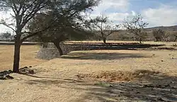The site main structure is unique in Mesoamerica; it is considered the first constructive stage, combining a large rectangular stepped structure with "sunken patios" (pool) and round structures built on top. The structure basement is stepped to adjust to the irregular terrains it was built on.[4]