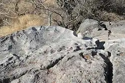 The stone that rings with a characteristic sound, when struck with another stone (the smaller round stone in the picture). It is a large basalt stone, part of a large stone group, it overhangs on the side of a hill, and it is already fractured, in at least three places.[4]