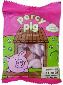 Percy Pig is a British brand of pig-shaped gummy raspberry, strawberry, cherry and grape-flavoured confectionery products made under licence in Germany by Katjes for Marks & Spencer which first appeared in stores in 1992. More than £10 million was grossed between June 2009 and 2010 in Percy Pig sales in Marks & Spencer's UK branches alone.[1] They contain just under 3.5% fruit juice and since May 2022 have been suitable for vegans.[2]