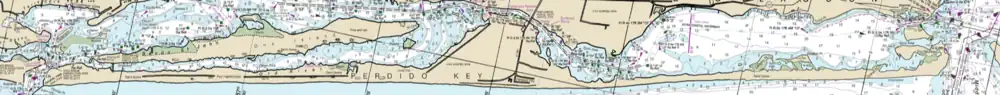 Perdido Key is a 24 kilometres (15 mi) long barrier island, narrow for most of its length, with a much wider portion in the middle. The Gulf of Mexico is south of the island. Old River separates the western part of the island from Ono Island, Alabama to the north; the central and eastern parts of the island are separated from the Florida mainland by the Intracoastal Waterway and Big Lagoon, respectively. The island ends on the west at Perdido Pass and on the east at Pensacola Pass. The eastern part of the island, 11 kilometres (6.8 mi) long, is in the Gulf Islands National Seashore and is mostly undeveloped. The Perdido Key Historic District, the site of three shore batteries built between 1890 and 1945 to protect the entrance to Pensacola Bay, is at the eastern end of the island. The western part of the island is mostly developed as a resort area, although the 290 acres (120 ha) and 1.5 miles (2.4 km) of beach in the Perdido Key State Park are undeveloped, except for park facilities. Most of the island is in Florida, but the westernmost 2 miles (3.2 km) are in Alabama. The developed part of the island in Florida forms the unincorporated community of Perdido Key. The part of the island in Alabama is in the city of Orange Beach. The undeveloped part of the island has foredunes that are 4 to 5 metres (13 to 16 ft) high. Dunes behind the beach are up to 6.1 metres (20 ft) high.[1][2][3][4]