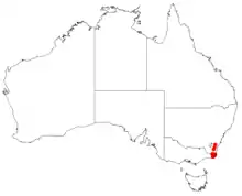 This geebung grows in eucalypt forest at altitudes between 200 and 1,100 m (660 and 3,610 ft) on a few peaks near the New South Wales–Victoria border and near the upper Genoa River in far eastern Victoria.[3][4][5]