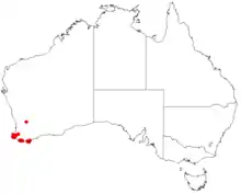 This geebung is found on poorly-drained or loamy soils in swamps, heath, woodland and forest within 40 km (25 mi) of the coast between Margaret River and Albany.[3][4]
