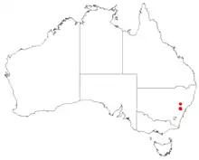 This persoonia is only known from nine populations in the Newnes State Forest, each population consisting of only one to a small number of individual plants. It grows in forest and woodland dominated by species of Eucalyptus.[4]