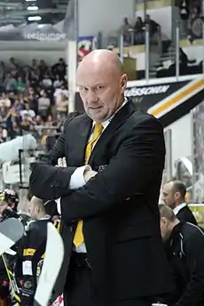 Peter Andersson coaching HC Lugano during a home game against Genève-Servette HC in October 2014