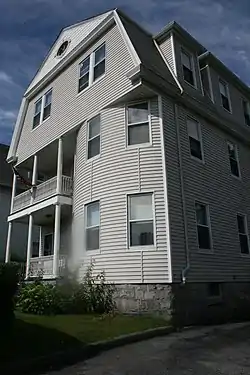The Peter Baker Three-Decker stands in a residential area on Worcester's south east side, at the southwest corner of Vernon and Alpine Streets. It is three stories in height, and of wood-frame construction with a largely vinyl-clad exterior. It is covered by a gambrel roof, with an area of decorative wooden shingles and an oculus window near the gable top. The right side of the front facade has a rounded bay set beneath the main roof, with a two-story porch on the left side. The ground floor porch columns are round,[2] while those on the second floor have been replaced by modern square posts. The third floor facade, set between the steep portions of the gambrel, has two sets of paired sash windows.[2]