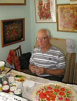 In 1970, Fedir Panko also founded the Experimental Workshop of Petrykivka Painting ("Експериментальний цех петриківського розпису”) under the auspices of the Dnipropetrovsk National Union of Artists of Ukraine in a building in the center of Petrykivka village. In contrast to the Factory of Petrykivka Painting, its works were mainly on wood and paper, and primarily on a light background (as opposed to the black background typically used at the factory). The work of the artists at the Experimental Workshop was more creatively free and diverse than at the Factory, where ordinary artisans primarily copied works by the artistic directors. In addition to Panko, the Workshop included the artists Hanna Isaieva, Nadia Shulyk, Nina Turchyn, Andrii Pikush, Maria Pikush, Tetiana Har’kava, Valentyna Deka, Lidia Bulavin, Maria Yanenko, Natalia Statyva-Zharko, Valentyna Panko, and Halyna Nazarenko.[12][16]